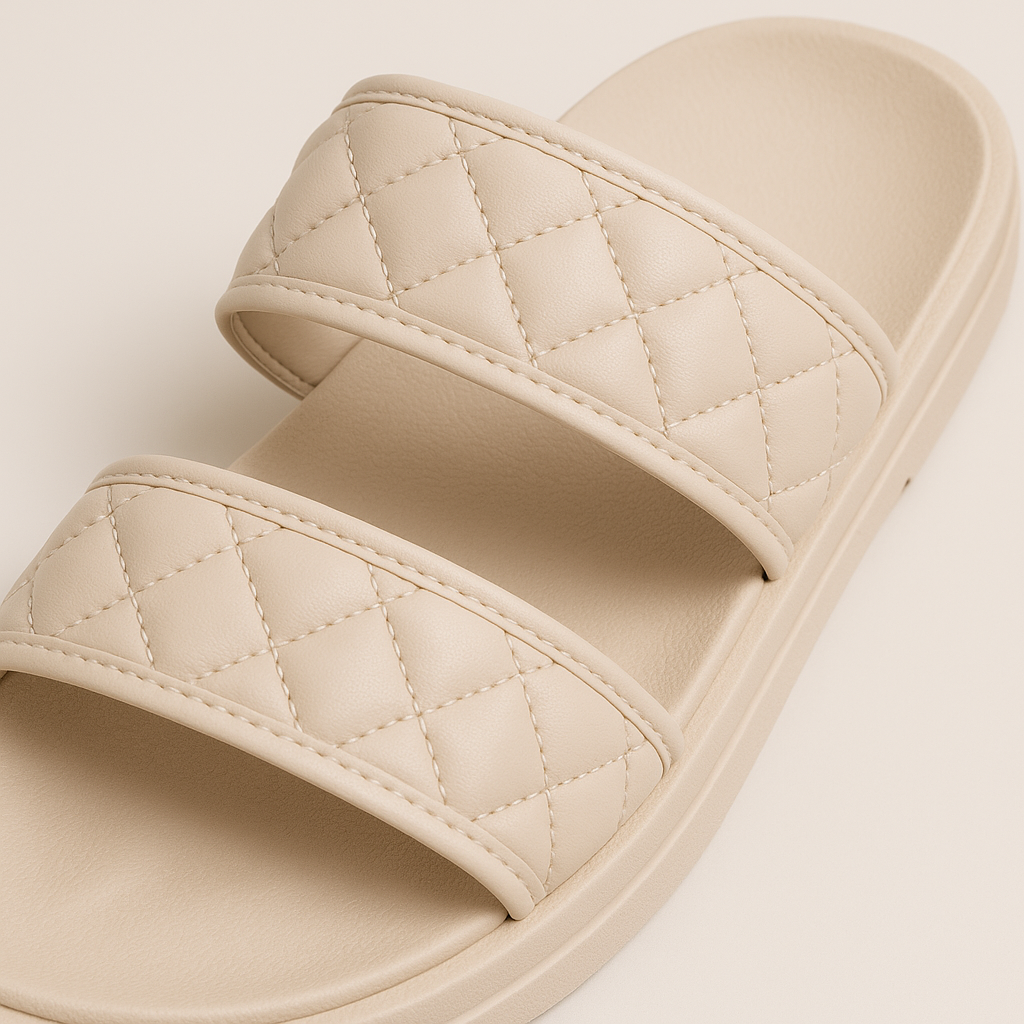 Experience elevated comfort and style with the Lacleo QuiltSoft Double Slide. These plush sliders feature a chic quilted double-strap design in a soothing beige tone, adding a touch of sophistication to everyday relaxation. The soft, cushioned footbed cradles your feet for luxurious support, making them an ideal choice for lounging at home, casual outings, or travel. Lightweight and easy to slip on, these sandals combine a premium look with practical ease, ensuring you step out in comfort and confidence no matter where your day takes you